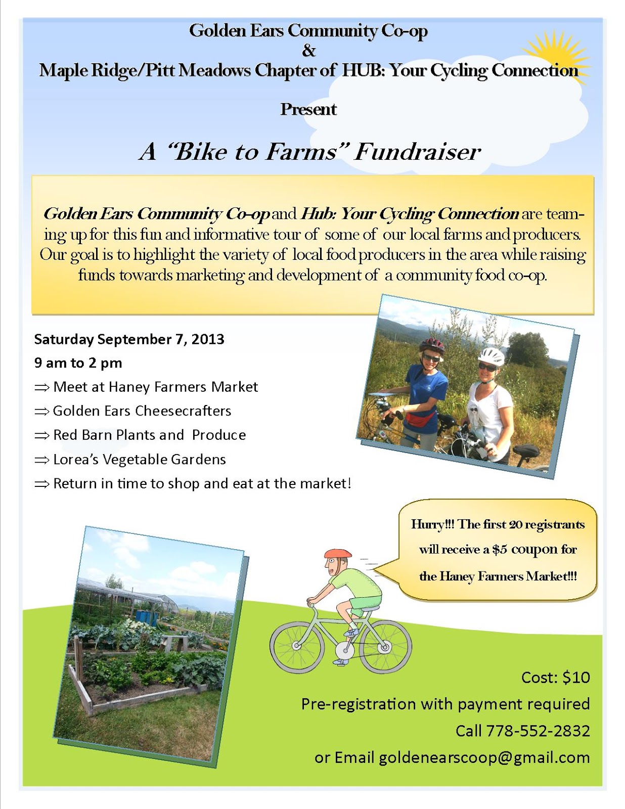 Mark on your calendar our next Discovery Bike Ride to several local farms/food producers on September 7! I’m quite excited about this one, because I think it’s so important to support the Golden Ears Food Co-op as well as our local food producers. The Golden Ears Food Co-op will make it easier for all of us to buy local food, and at the same time it will be easier for local food producers to sell to us whatever they produce.
