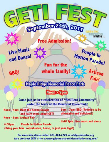 You may wonder what this is all about: “GETI Fest”. What is GETI? It stands for “Golden Ears Transition Initiative“. GETI tries to raise awareness in Maple Ridge and Pitt Meadows about global warming, peak oil and the impact of our continued unsustainable lifestyles on our planet, and help to prepare ourselves for a less fossil-fuel dependent economy. Check out GETI’s website to find out more.