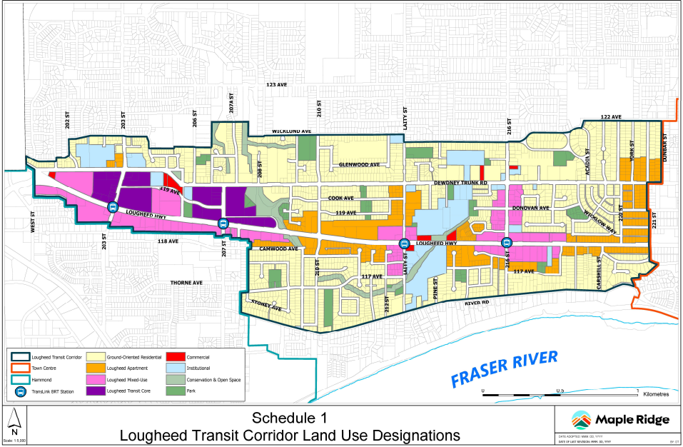 The plan calls for significant densification along the corridor, and more commercial and mixed-use development, supported by future Bus Rapid Transit along Lougheed Hwy and a more walkable urban environment to improve mobility options, encourage multi-modal transportation (walk/bike & transit), and thus help reduce car dependency. You can find more about the plan on the City’s website.