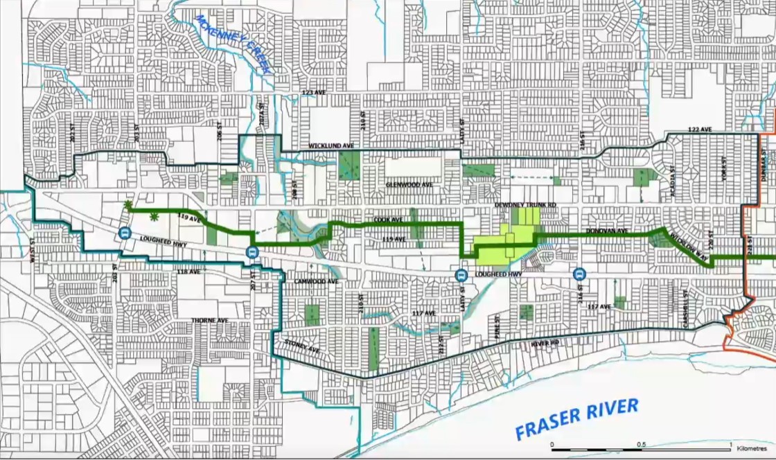 The relatively low-cost short-term solution is implementing a low-speed neighbourhood bikeway along the existing roadways, and to fix gaps such as the Maple Ridge Cemetery and the McKenney Creek area.