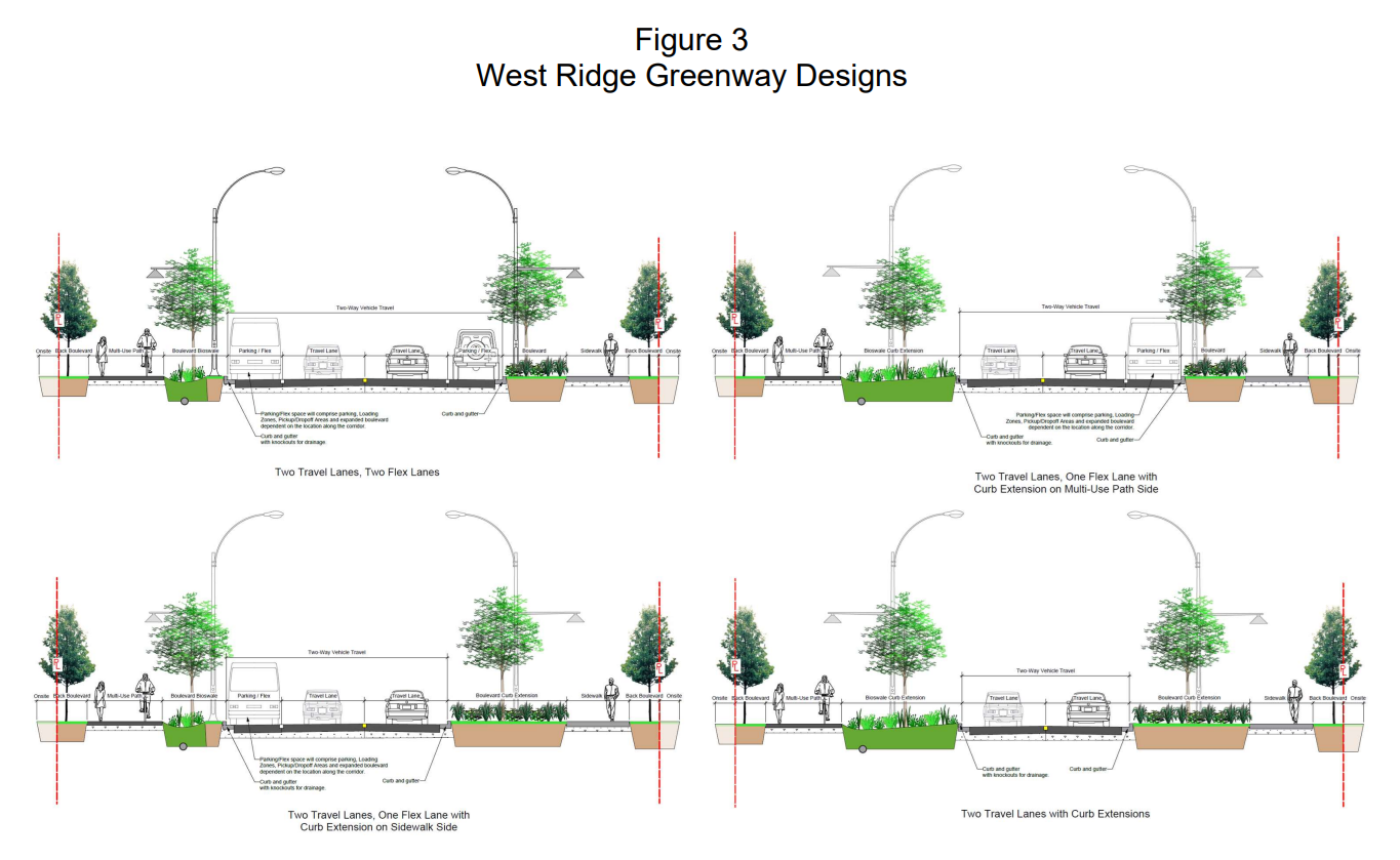 And here is an image showing the selected designs for the Greenway, all with a multi-use path on one side and a sidewalk on the other: