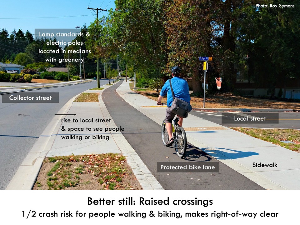 - continuous pathways, i.e. elevated through driveways and intersections to improve safety for vulnerable users (this will help slow down motor vehicles exactly where they cross active transportation infrastructure);