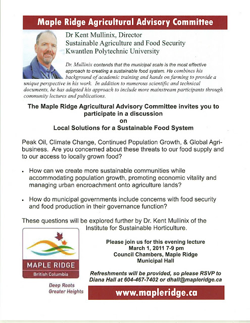 February 25 2011 Sustainable Food Production – local lecture Jackie Chow Ridge Meadows The Maple Ridge Agricultural Advisory Committee invites you to participate in a discussion on local solutions to a sustainable food system.