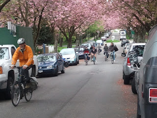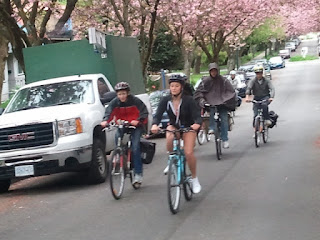 Despite a few raindrops we had a great time riding the Central Valley Greenway to yesterday’s Year of the Bike Party in Vancouver. Met up with some other people on bikes and got to enjoy some of the cherry blossoms along the way (yesterday was also the day of the annual “Bike the Blossoms”).